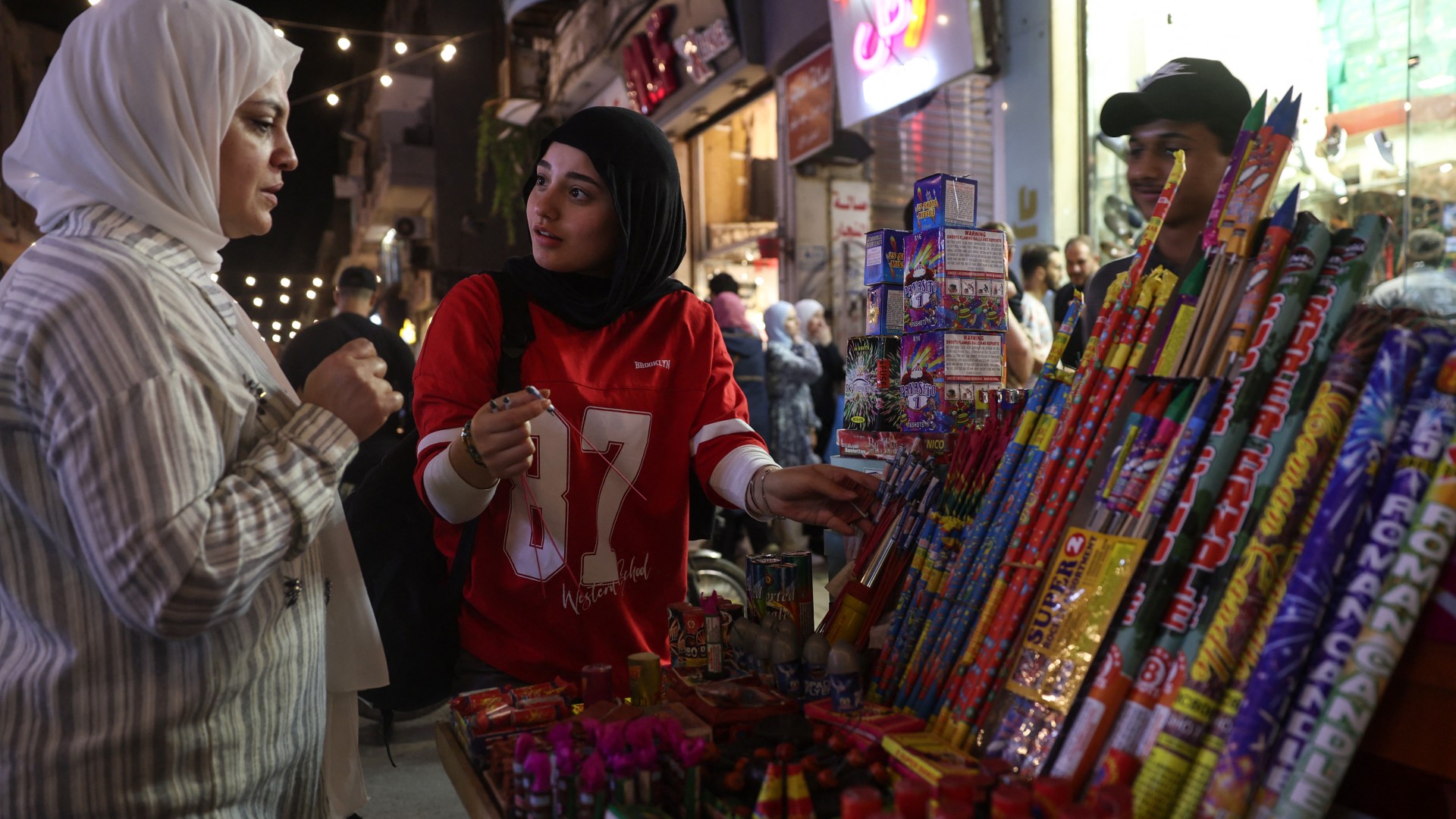 Women buy fireworks as people gather at a popular market in central Homs, Syria, to buy presents and clothing for the Muslim feast of sacrifice, on 4 June 2025 (Omar Haj Kadour/AFP)