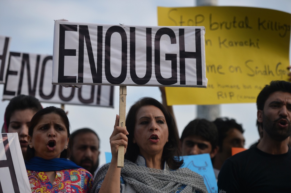 Shiite Ismaili demonstrators gathered in Islamabad on Wednesday carrying placards reading “Enough” protesting the continued killing of their sect, while human rights groups condemned the government's failure to prevent the attack.