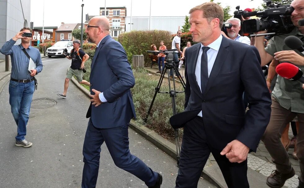 Belgian Prime Minister Charles Michel, left, and Charleroi's mayor Paul Magnette arrive on Sunday at hospital Notre-Dame in Charleroi, where wounded policewomen are being treated (AFP)