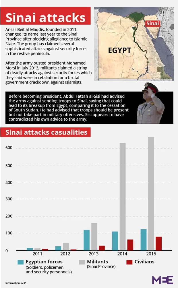 Most of the soldiers were not killed in direct face-to-face clashes with IS, but by militant rockets and explosives, or after shooting sprees that followed suicide bombings, according to Shorbagy, who cited sources in Sinai.