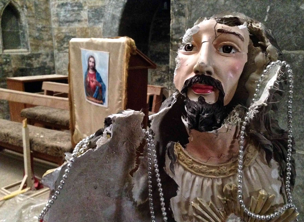 Around him, religious images have been torn from the walls, statues beheaded and crosses broken. “IS achieved what they wanted here, which was not just to destroy religious buildings but also to destroy the feelings and the very souls of the Christians here.”