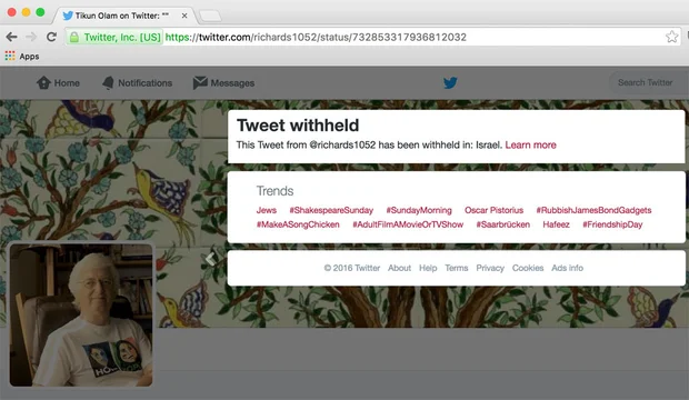 Twitter later informed him that the post had been restricted from Israeli viewing: