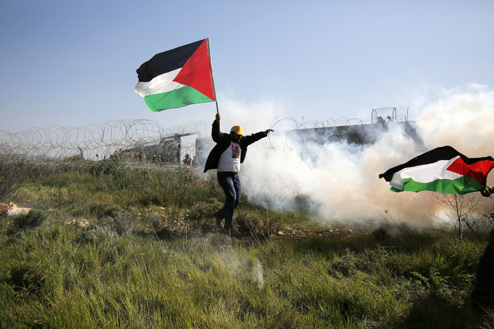 A Palestinian protester, holding a national flag, runs away from tear gas smoke during clashes with Israeli security forces following a march on 19 February 2016 in the West Bank village of Bilin (AFP)