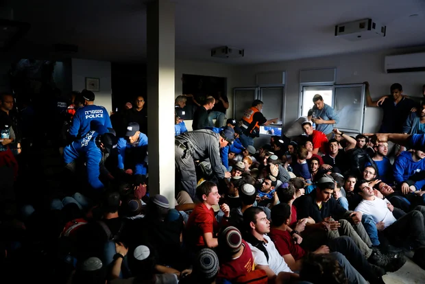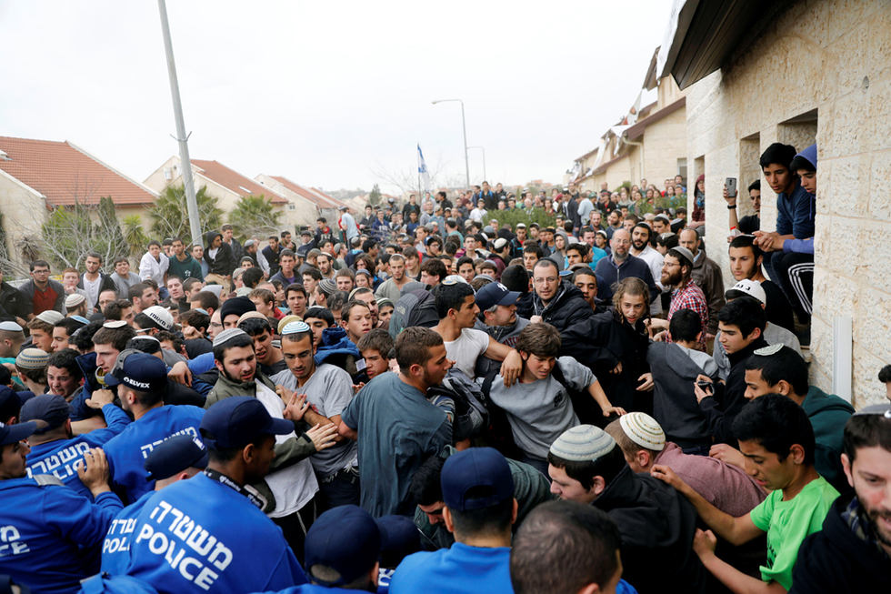 Israeli policemen remove pro-settlement activists and residents from several homes in the Israeli settlement of Ofra, in the occupied West Bank (Reuters)