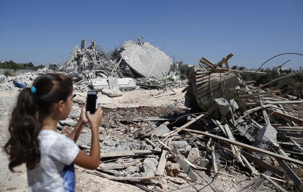 A Palestinian girl photographs the rubble of a house that was demolished by Israeli bulldozers in Qalandia (AFP)