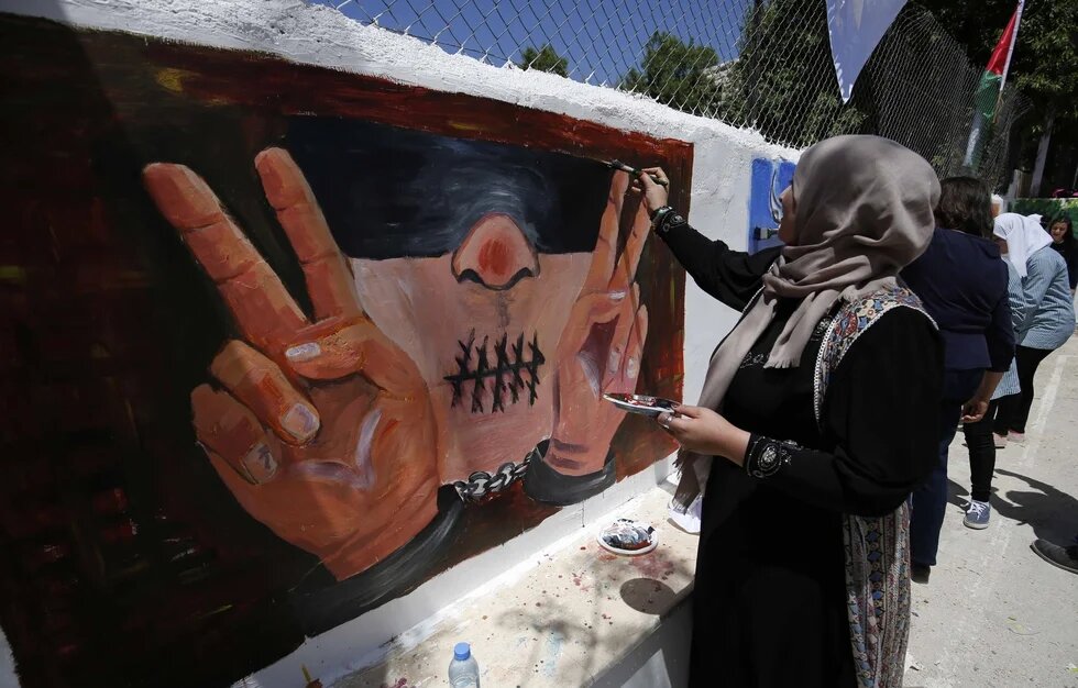 Palestinian women paint murals as they mark Palestinian Prisoner Day in the West Bank city of Ramallah on 17 April 2016 (AFP)