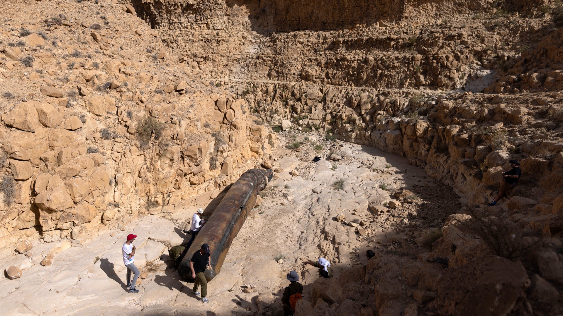 Israeli plain-clothed military personnel examine a part of an Iranian ballistic missile, recently located in an open area near the city of Arad in southern Israek, on 24 April 2024 (AFP/Oren Ziv)
