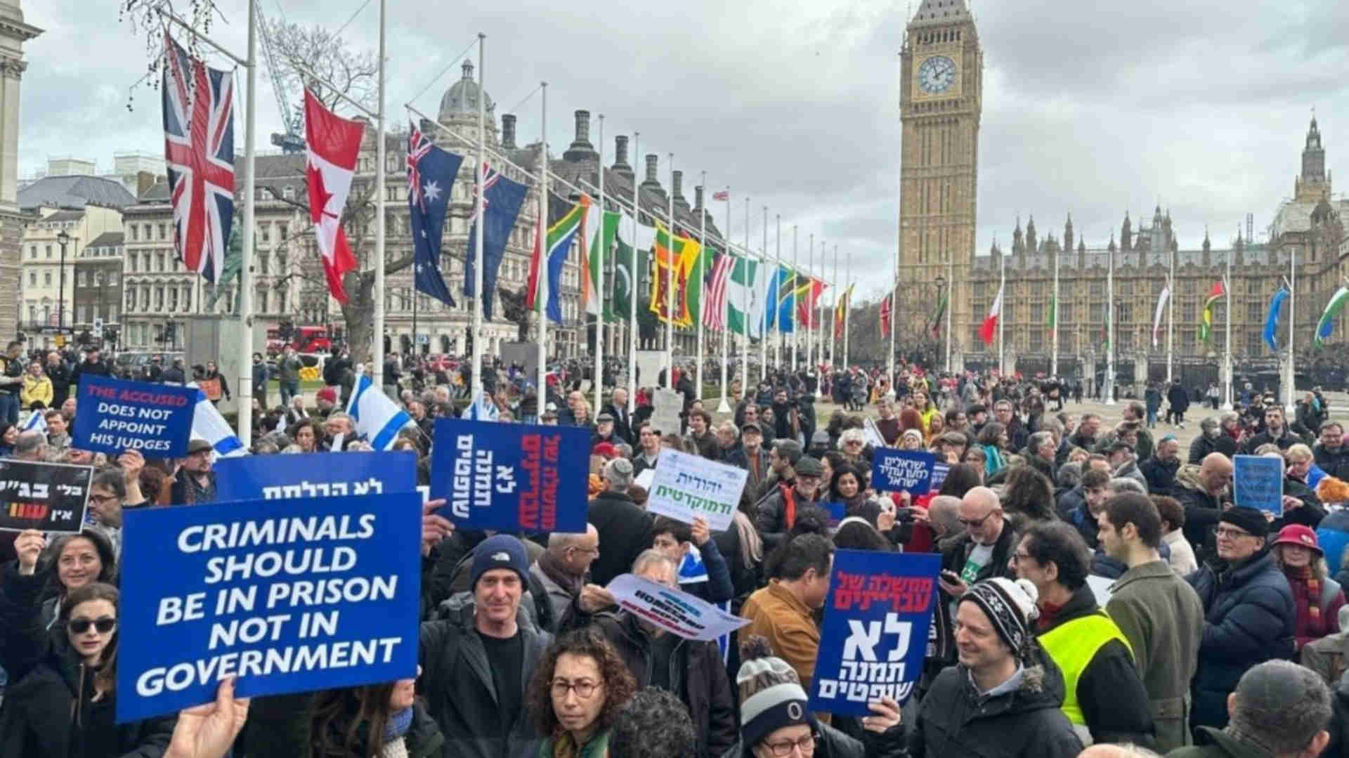 Standing outside the Houses of Parliament, protesters demanded that Israeli Prime Minister Benjamin Netanyahu row back on the judiciary proposal under the banner of "defend Israeli democracy".