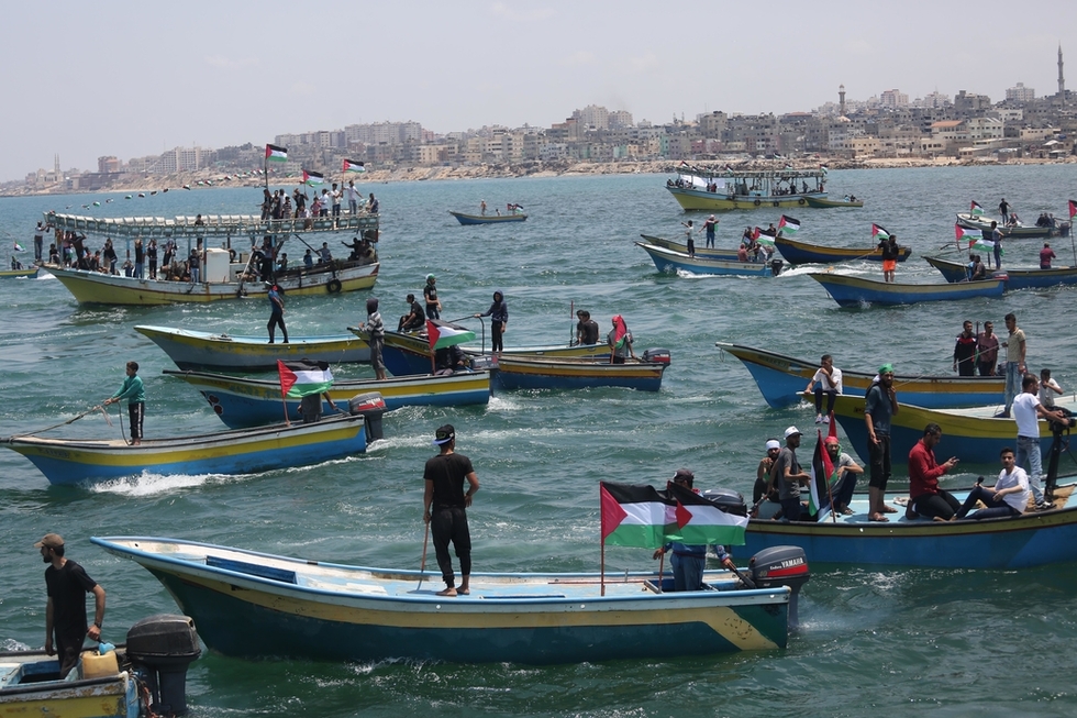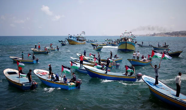The smaller boats peeled off gradually as the leading boat attempted to reach the six-mile fishing limit imposed by the Israeli authorities on Gaza.