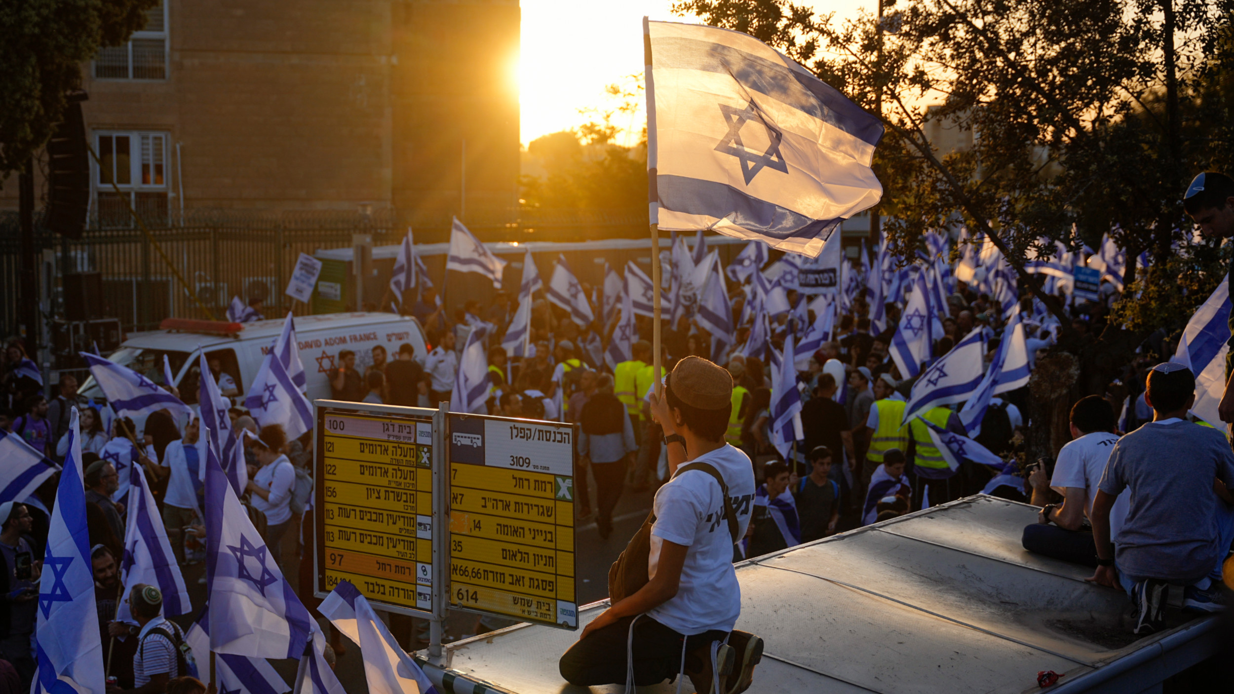 They waved Israeli flags and gathered in front of parliament in Kaplan Street, chanting "the people demand judicial reform" and "fire Miara".