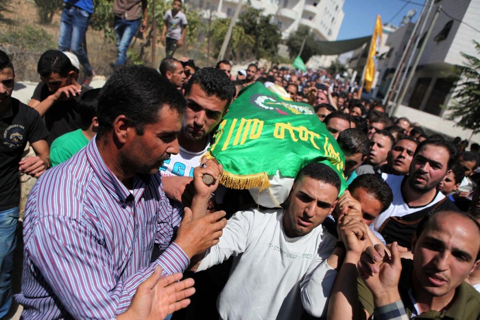 Palestinians carry the bodies of Amer Abu Eisha and Marwan Qawasmeh who were killed by Israeli troops in the West Bank town of Hebron on 23 September, 2014 (AA)