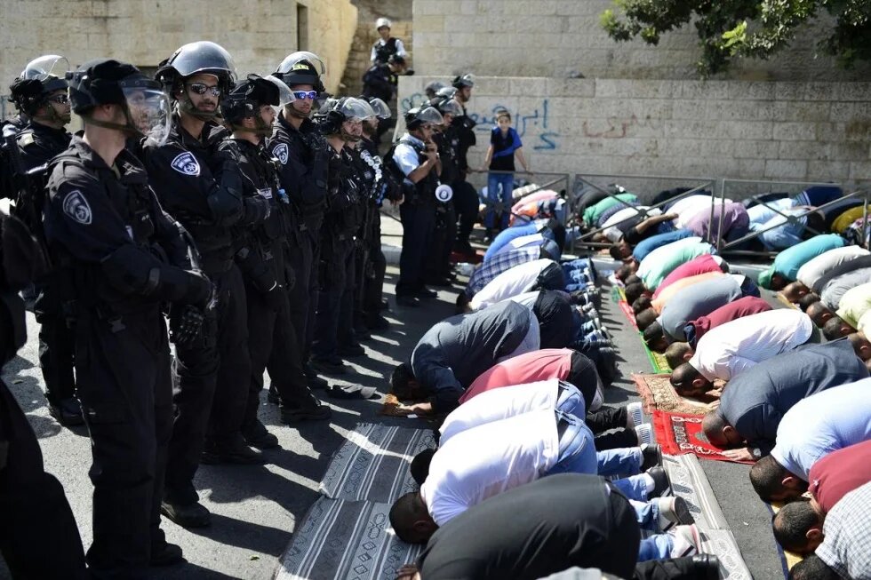 Palestinian worshippers restricted from entering Al-Aqsa Mosque so they pray in streets of Jerusalem 10 Oct.