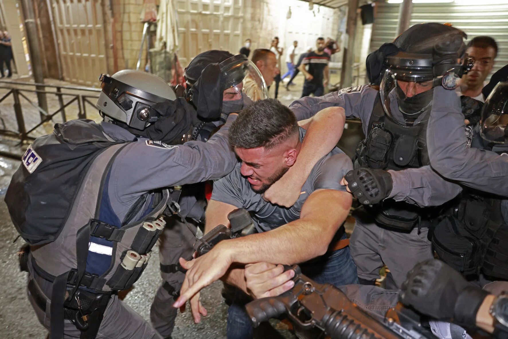 Israeli border police forces detain a Palestinian protester at Damascus Gate, one of the entrances to Jerusalem's Old City and a symbolic gathering space for Palestinians (Reuters/ Ronen Zvulun)