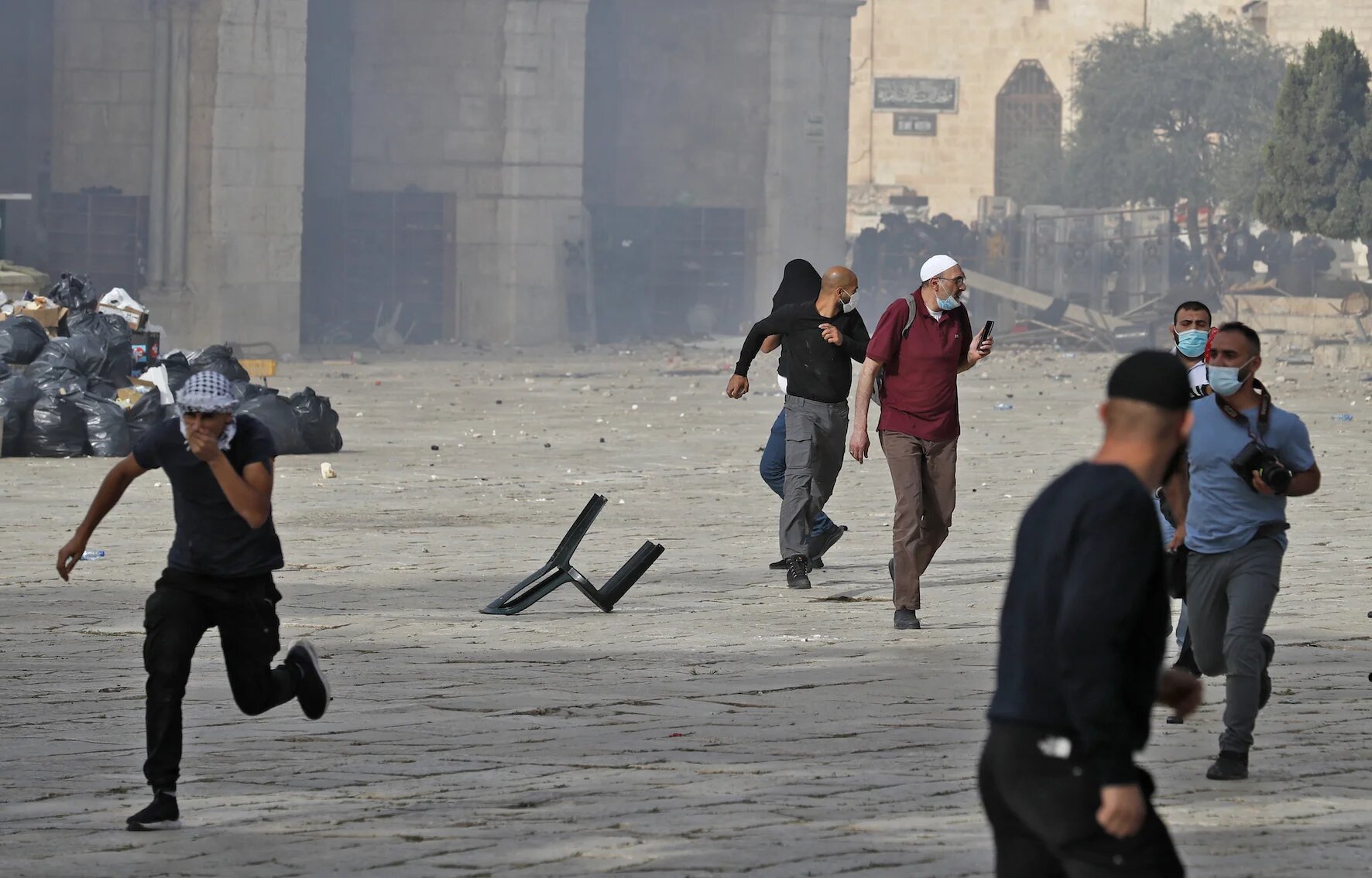 Israeli police attempted to force people out of the al-Qibli shrine towards the exits using tear gas (Reuters/ Ammar Awad)