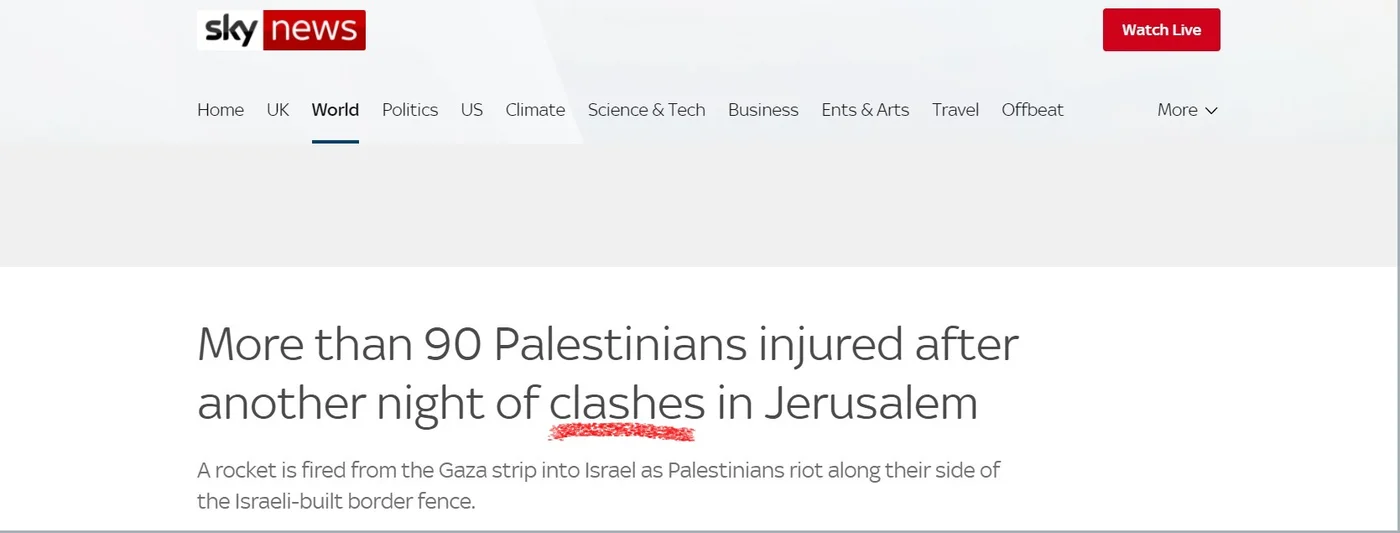 Often, the target of criticism is language that appears to equivocate between unequal sides - particularly the use of terms such as "clashes" or references to "violence" in the passive voice that do not attribute the cause or target of the violence.