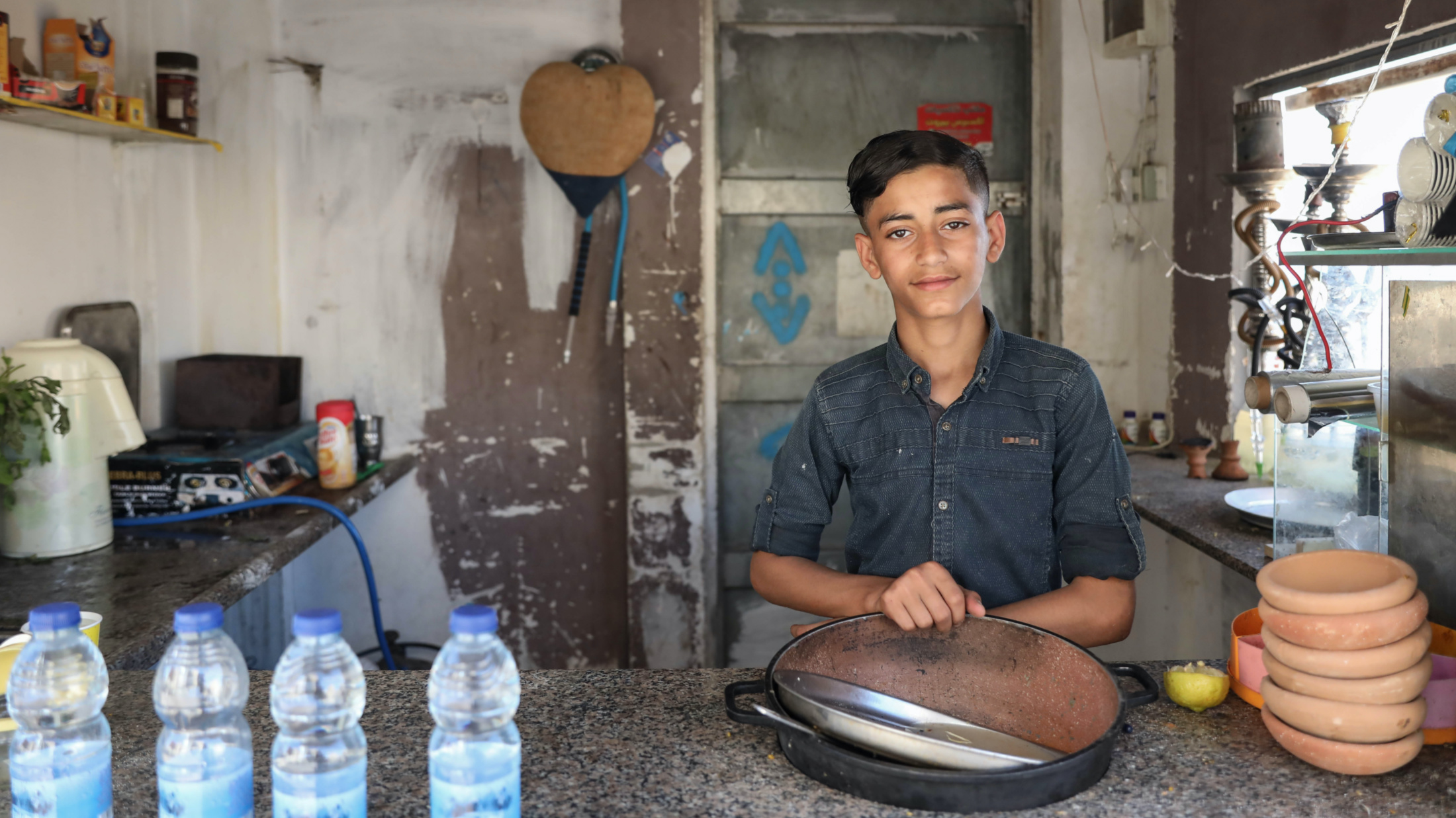 This year, Jabr celebrated his 15th birthday during his regular 14-hour shift at his uncle’s seaside cafe, where he works as a waiter to support his family.