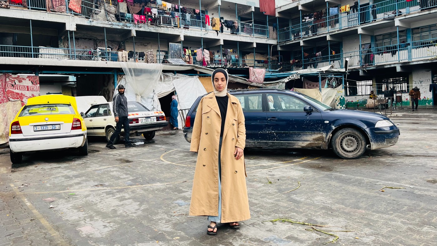 Mayar al-Jakhbir, 20, pictured outside a school she was sheltering in, February 2024 (MEE/Khaled Malfouh)