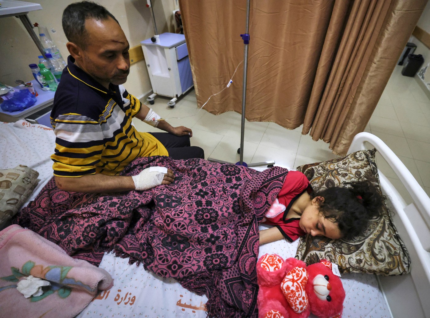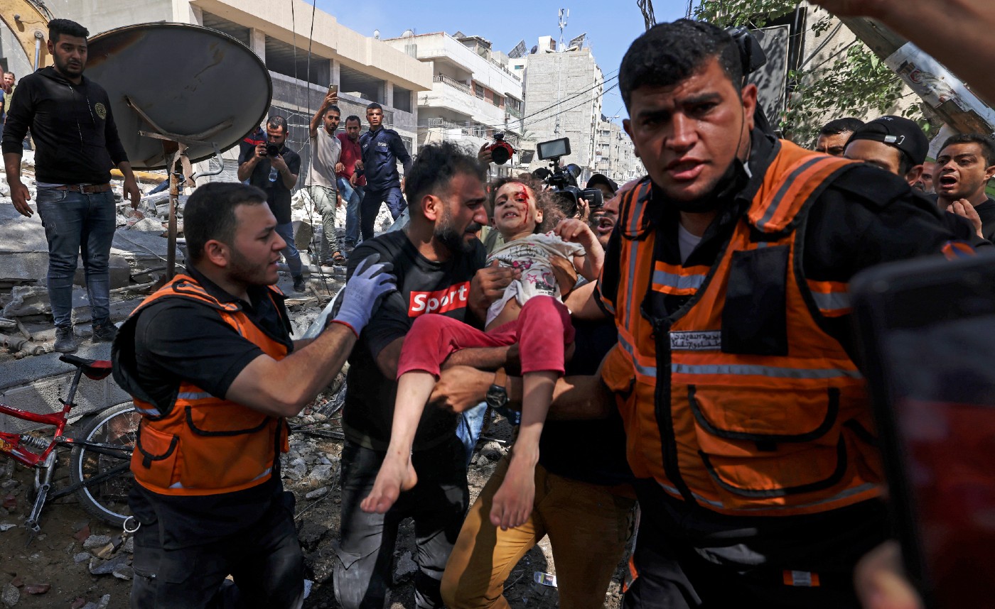 Palestinian Suzy Eshkuntana is carried pulled from the rubble in Gaza City's Rimal district on May 16, 2021, after an Israeli air strike killed the rest of her family apart from her father (AFP).