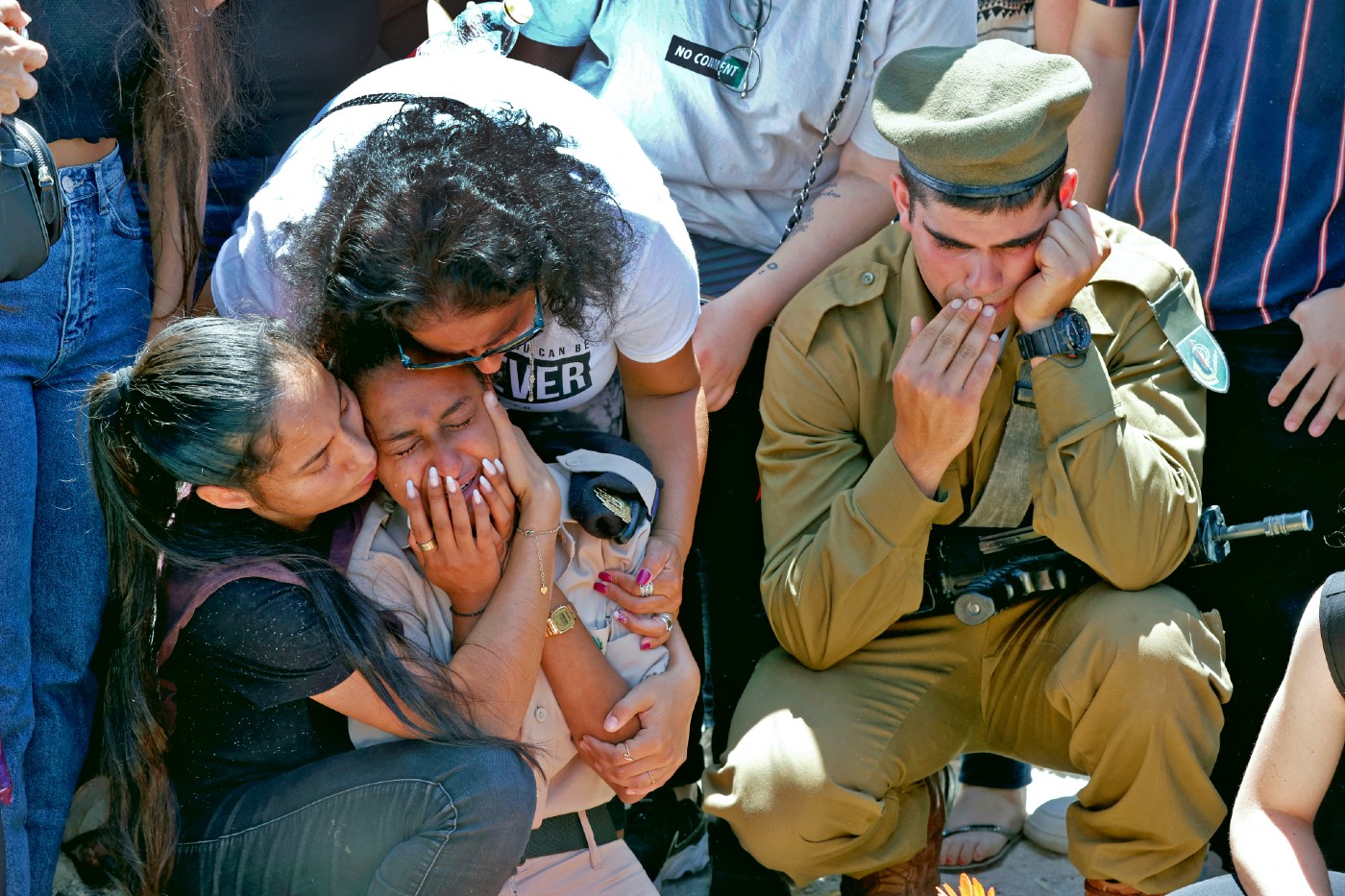 Israeli mourners attend the funeral of Israeli soldier Omer Tabib, 21, in Elyakim on May 13, 2021 (AFP)