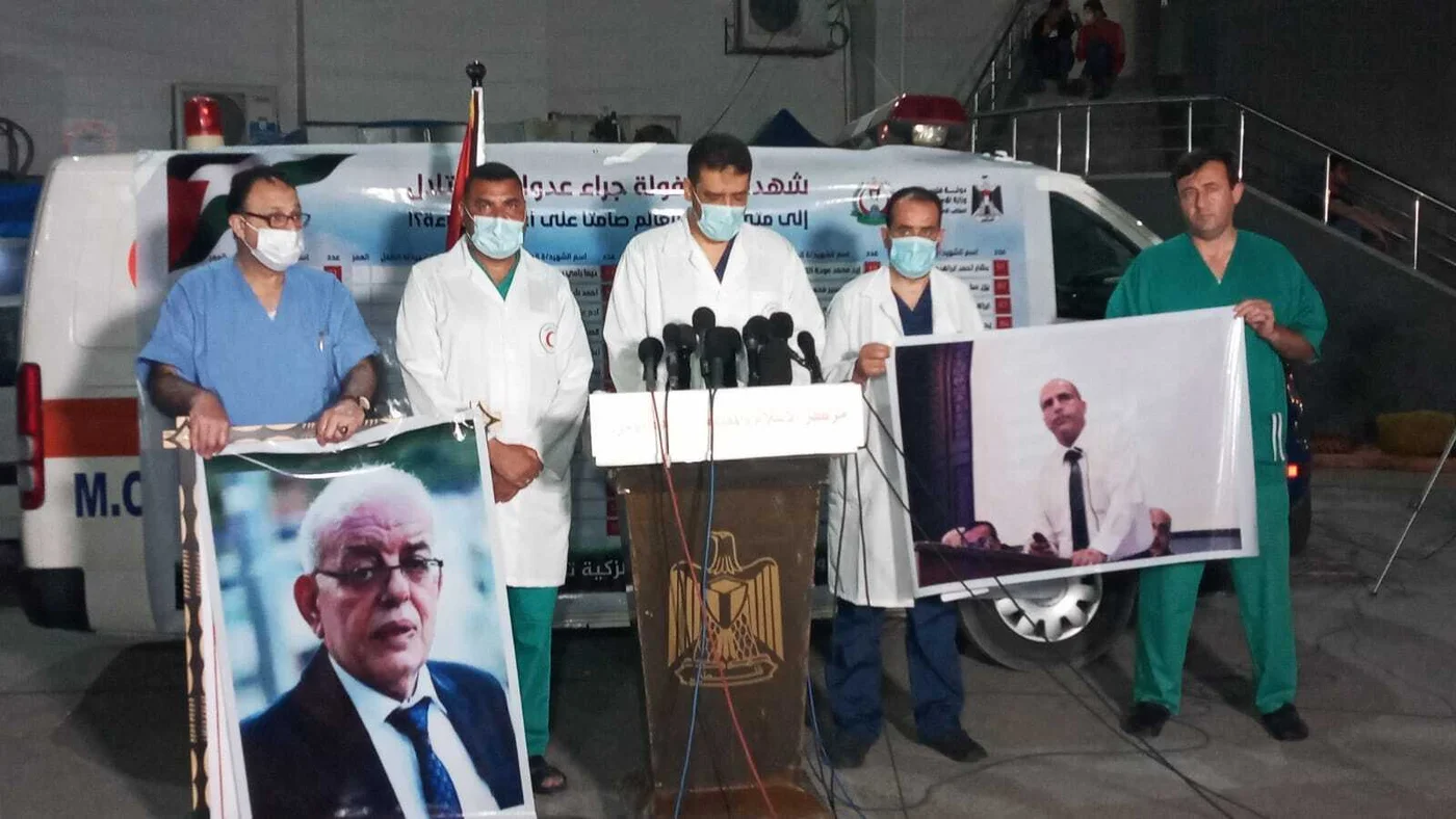 Medical staff in Gaza pay tribute to Dr Mueen al-Alloul (left) and Dr Ayman Abu al-Auf (Gaza Ministry of Health)