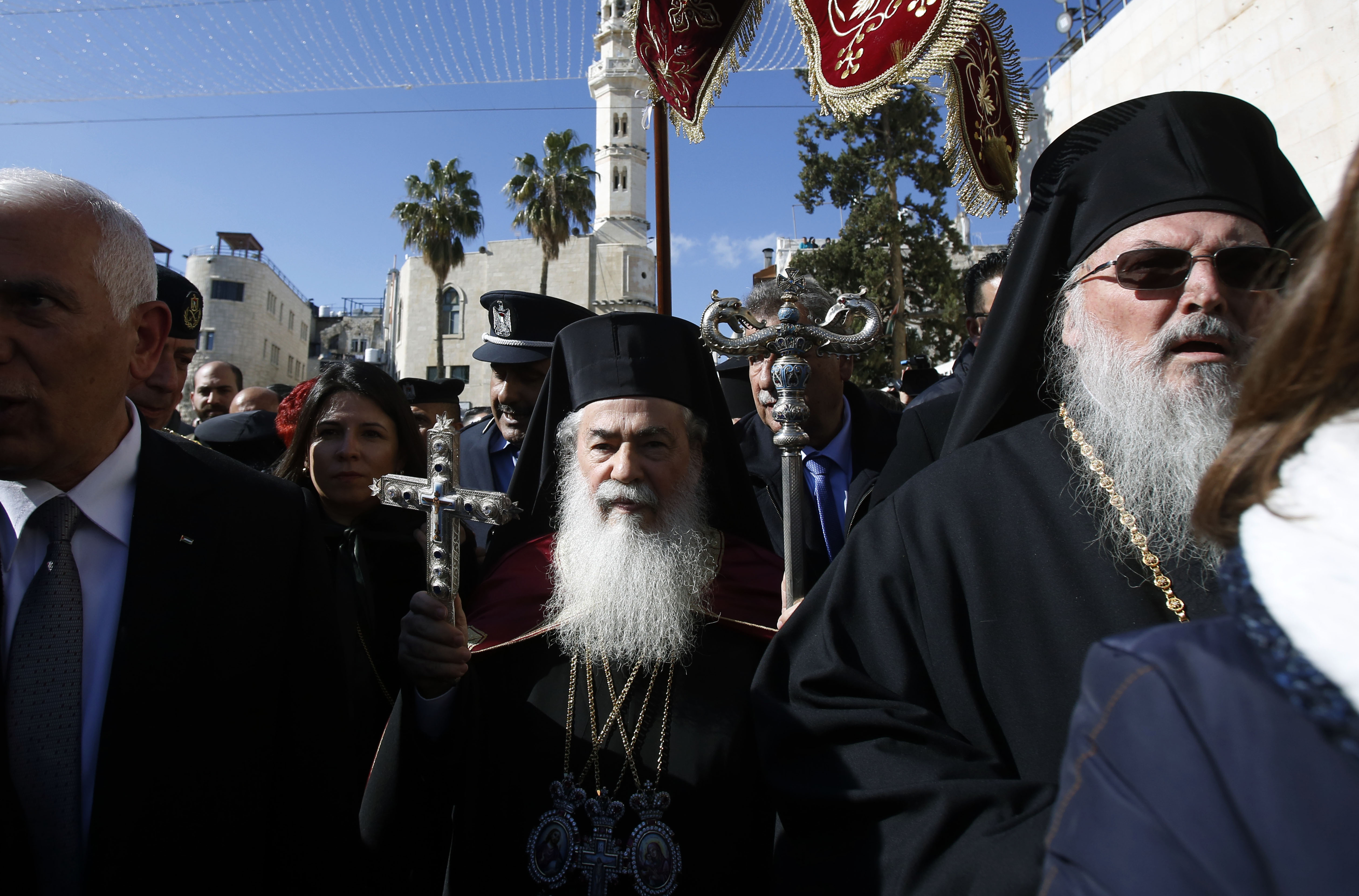 Jerusalem's Greek Orthodox Patriarch Theophilos III arrives in Bethlehem, 6 January (AFP)