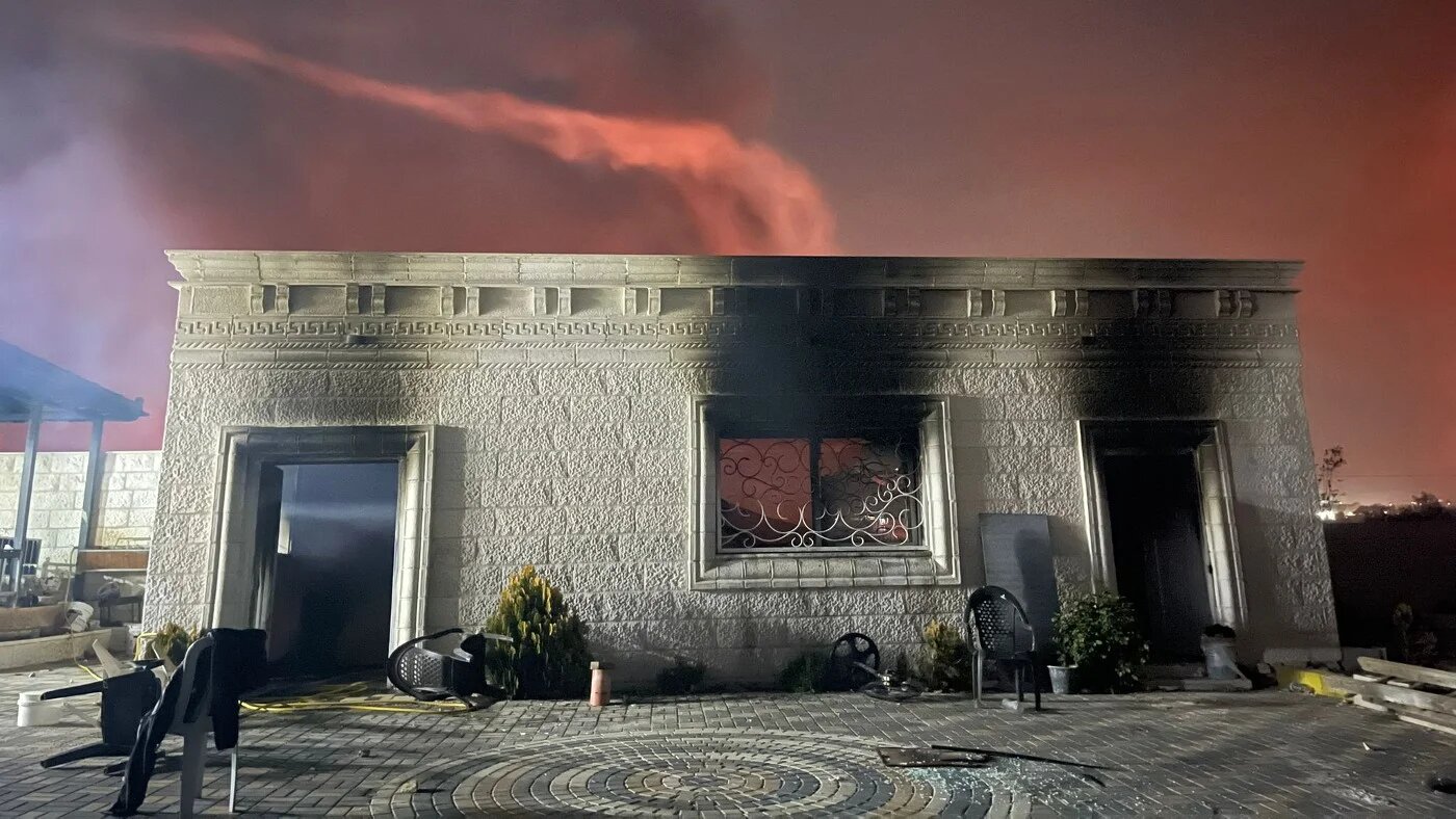 Fire rises behind a burning building on the night of 26 February during a rampage by Israeli settlers (MEE/Hisham Abu Shaqrah)