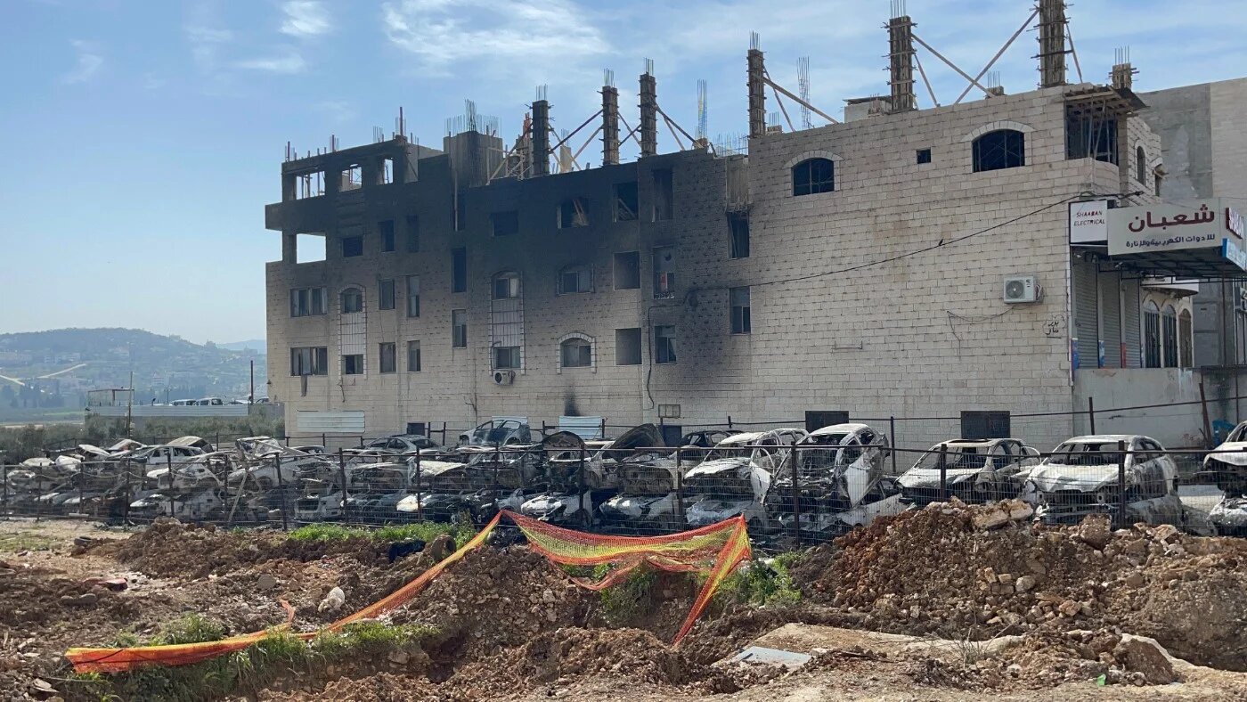 An aerial view of a scrapyard where cars were torched overnight by Israeli settlers, in the Palestinian town of Huwwara near Nablus in the occupied West Bank (AFP/Ronaldo Schemidt)