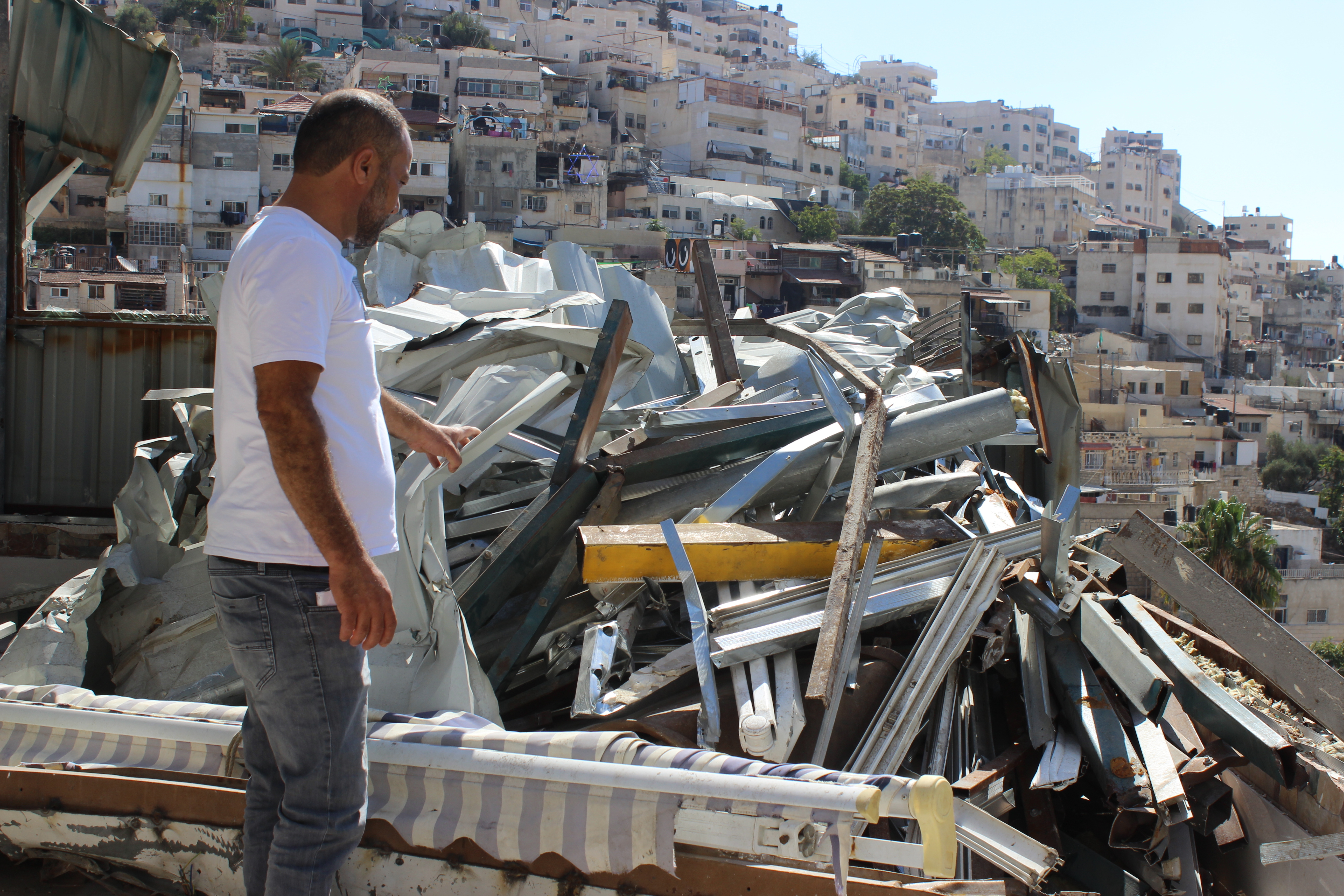 Nidal al-Rajabi stands in front of the ruins of his shop in the Bustan neighbourhood, Silwan, south of Al-Aqsa Mosque (Supplied)