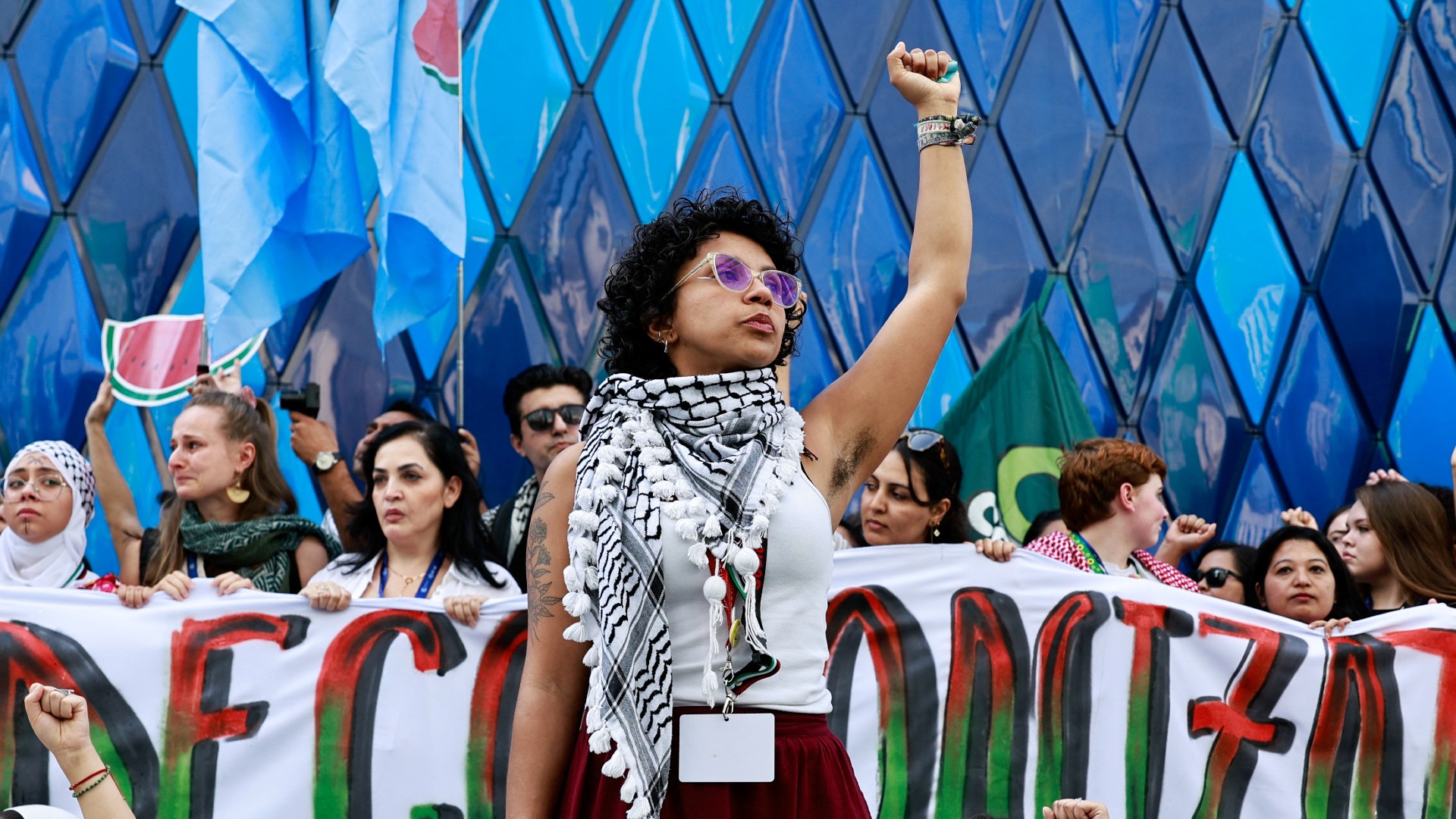 Banned from raising the Palestinian flag, activists held watermelons aloft instead and chanted "no climate justice without human rights".