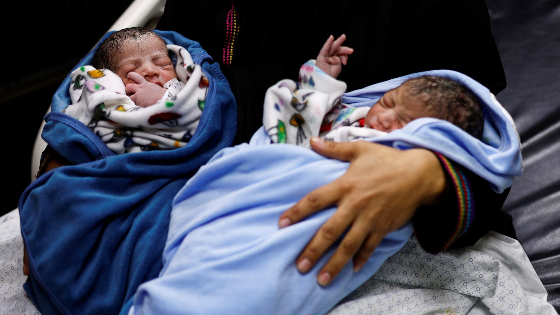 A Palestinian woman Iman holds her newborn twins in Khan Younis in the southern Gaza Strip, 2 November (Reuters)