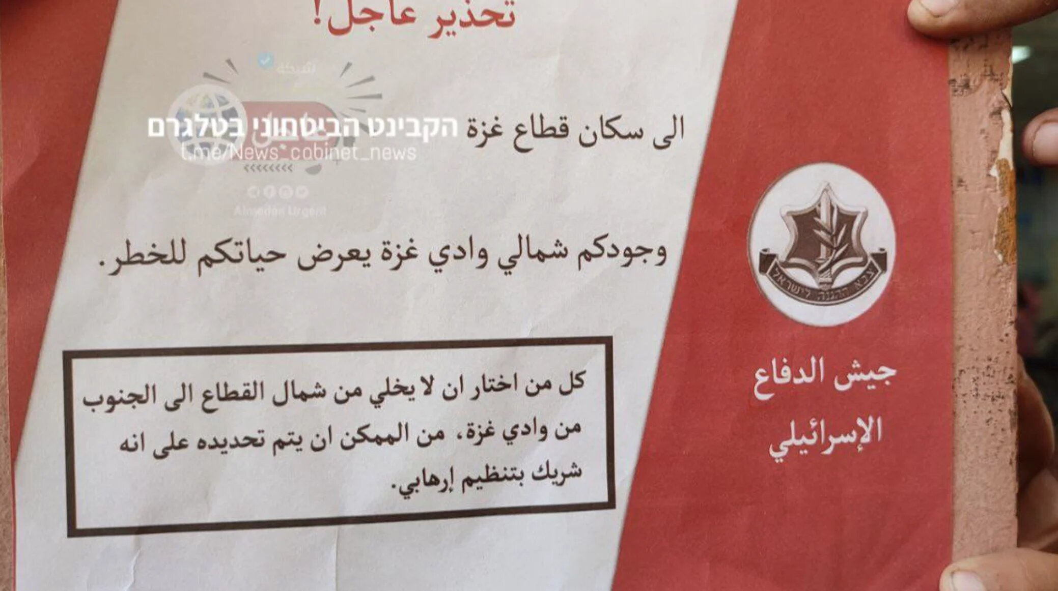 "Gaza has been transformed into a battlefield," the leaflet read. "For your safety, you must not return to your homes until further notice."