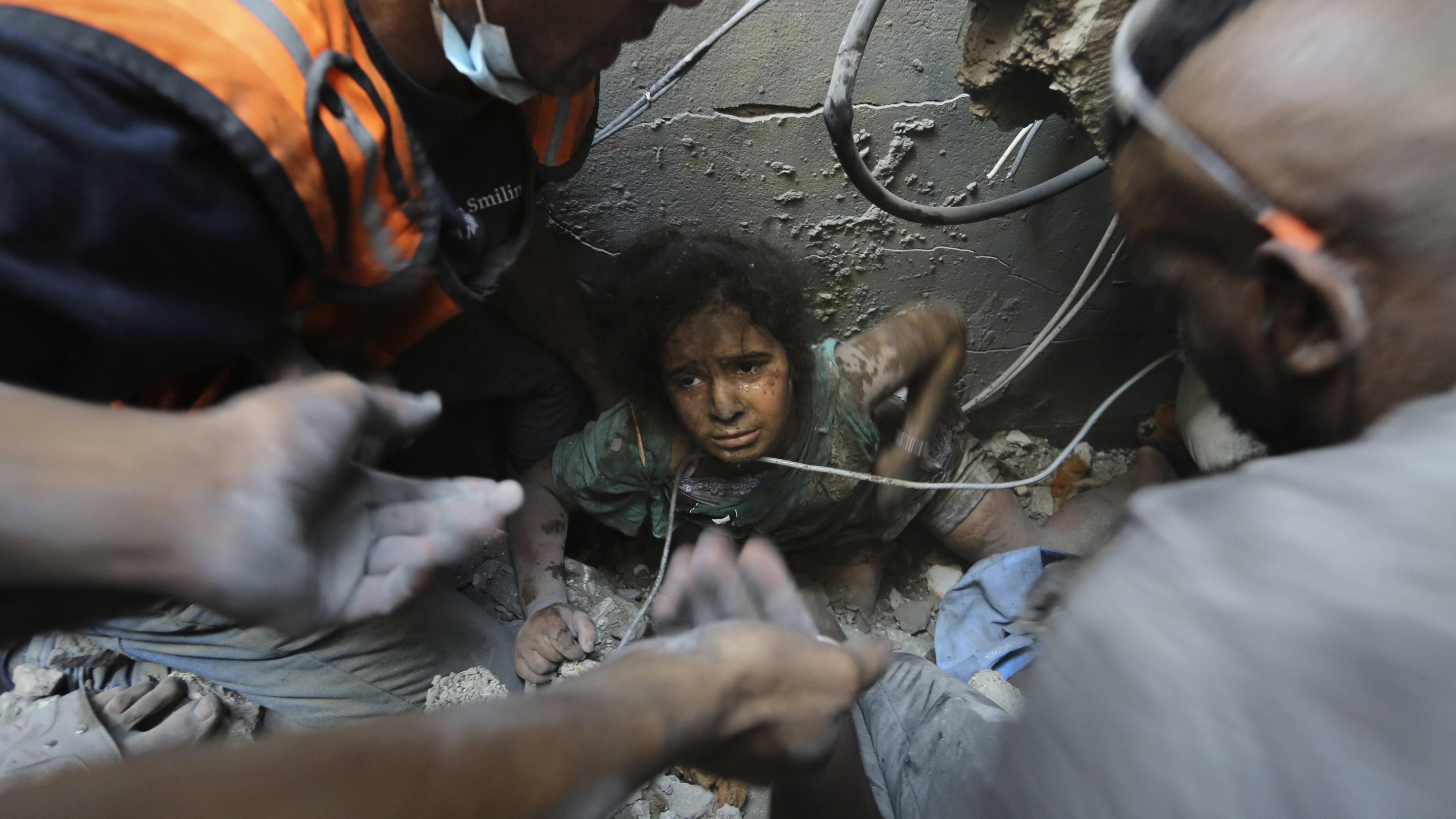 Palestinians try to pull a girl out of the rubble of a building that was destroyed by Israeli air strikes in Jabaliya refugee camp, on 1 November 2023 (AP)