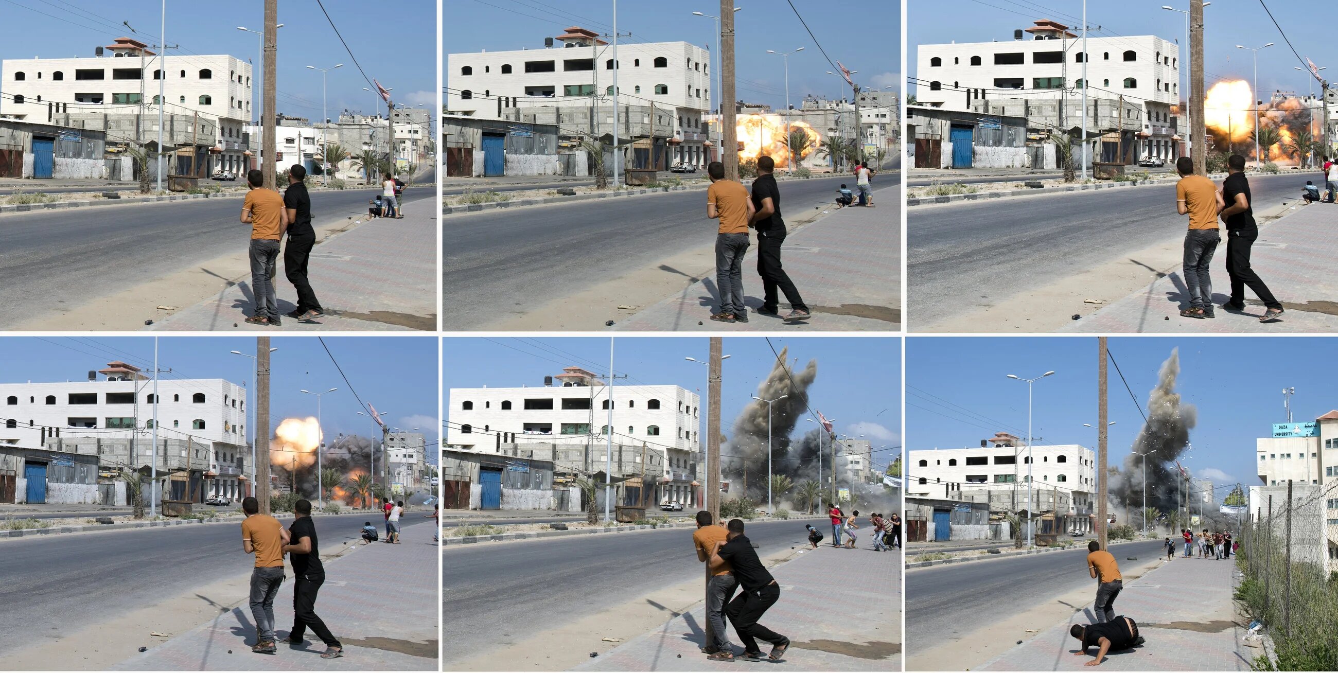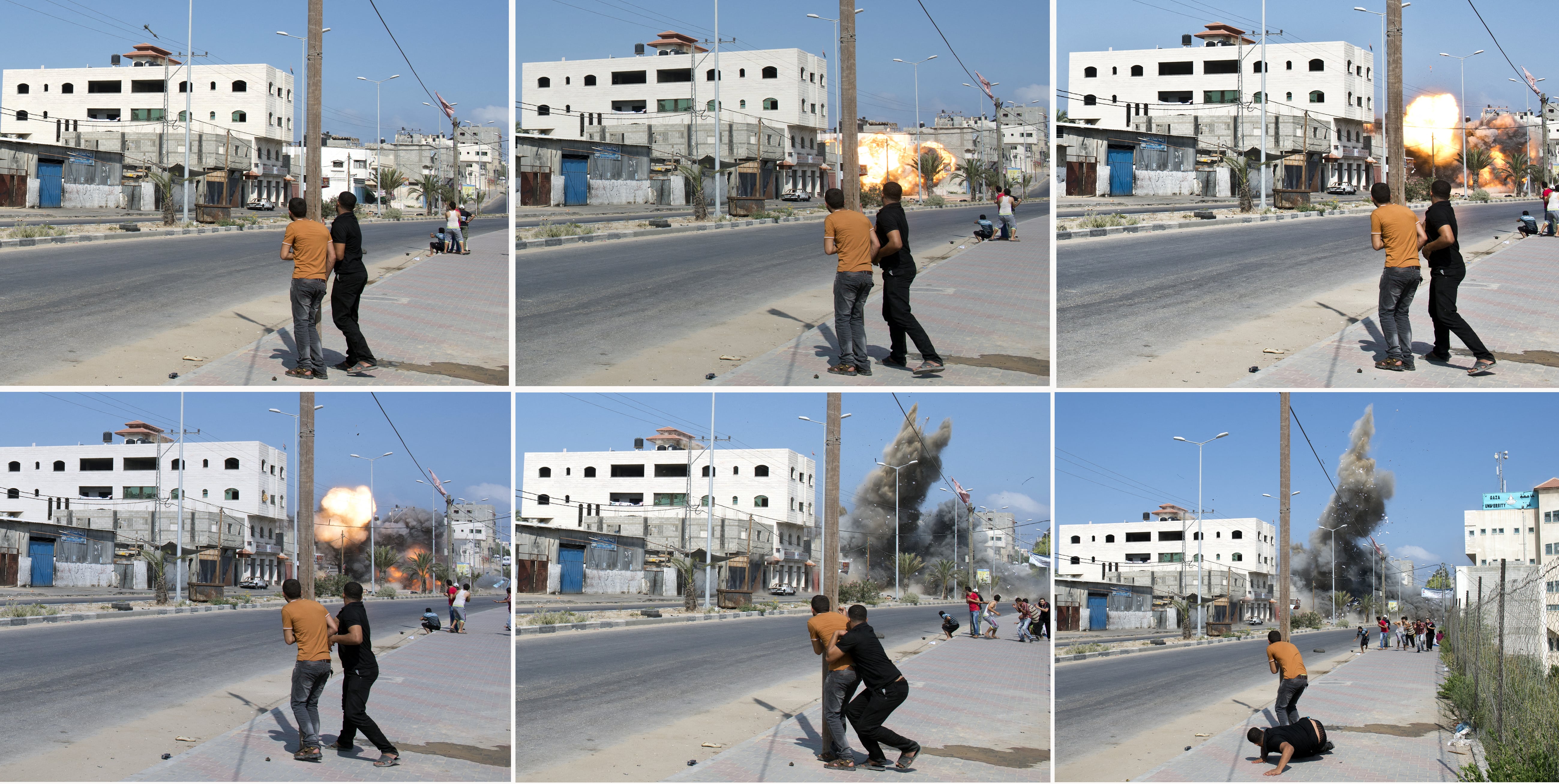 A combination of pictures taken in Gaza City on 23 August, 2014 shows Palestinian men watching then running as an Israeli bomb hits a target in the Palestinian enclave. (AFP)