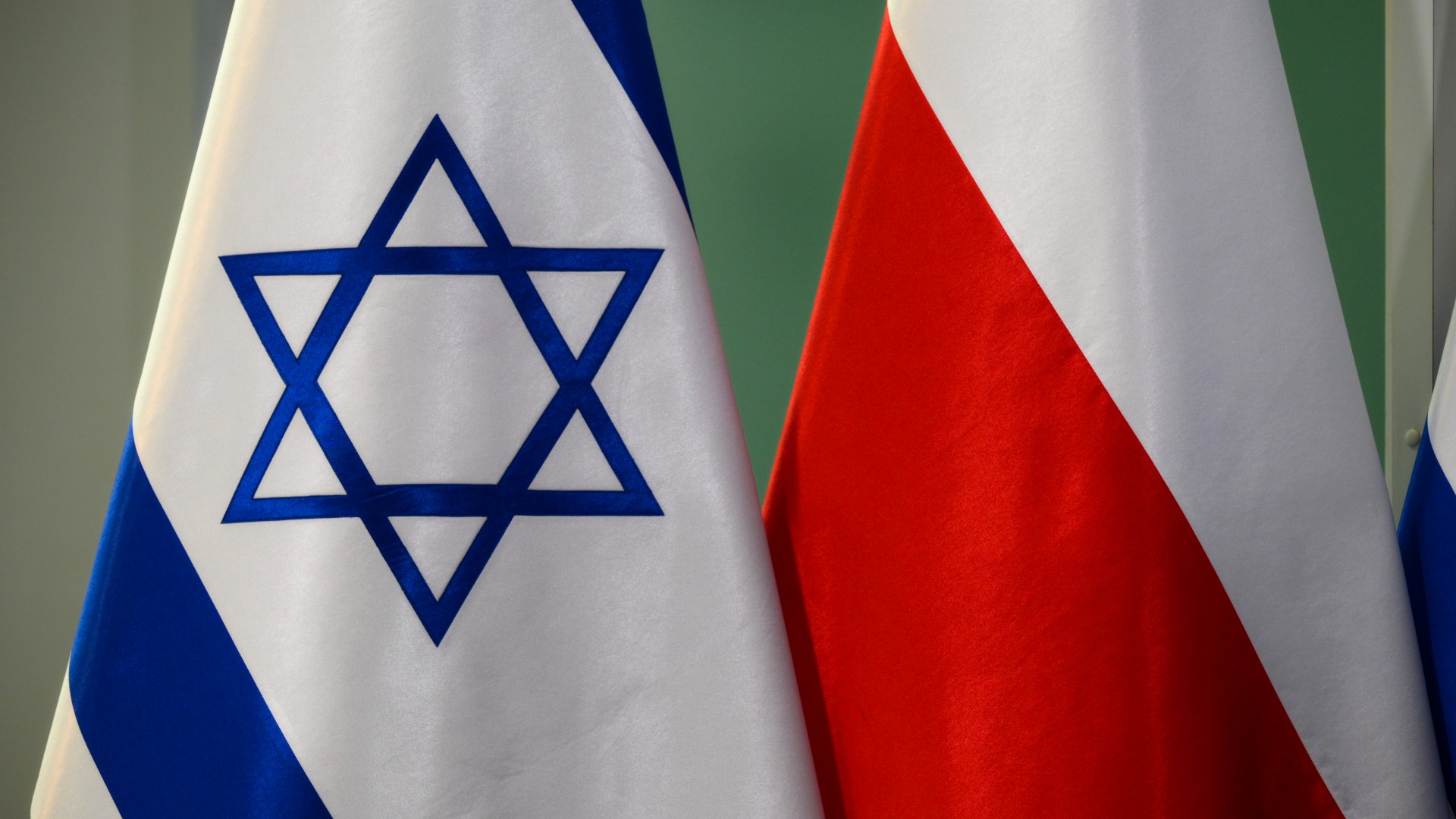 Israeli and Polish flags are seen at the foreign ministry in Warsaw, Poland on 22 March (Reuters)