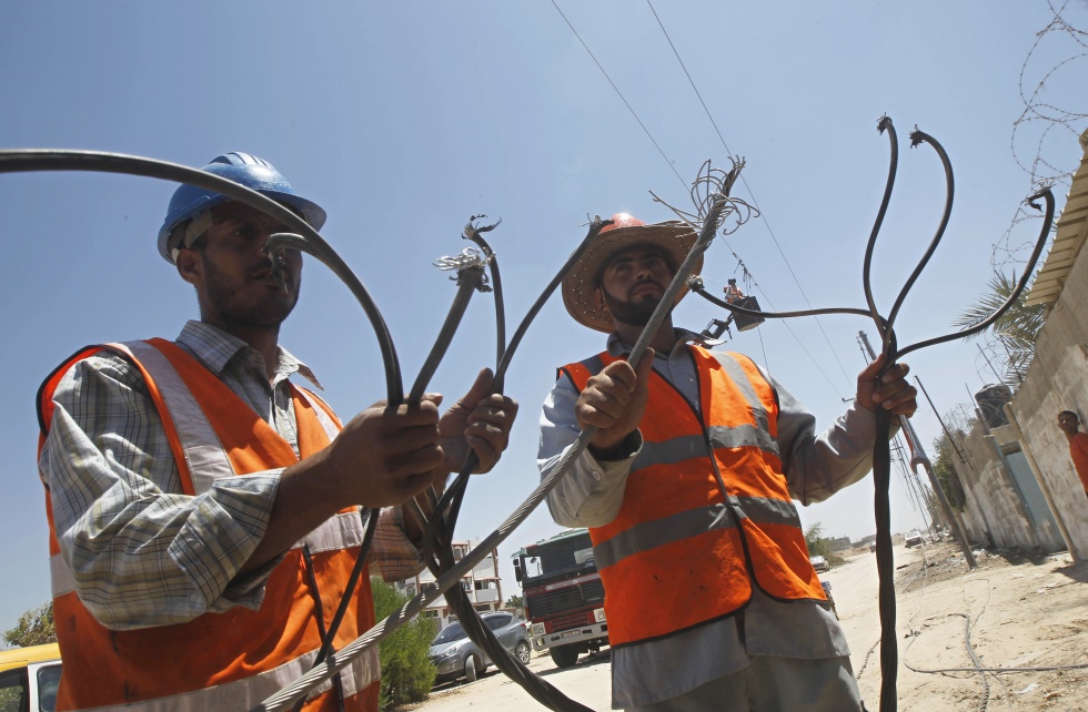 Palestinian electricity company workers inspect power lines destroyed following an Israeli air strike in Rafah in the southern Gaza Strip, on 6 August, 2014 (AFP)