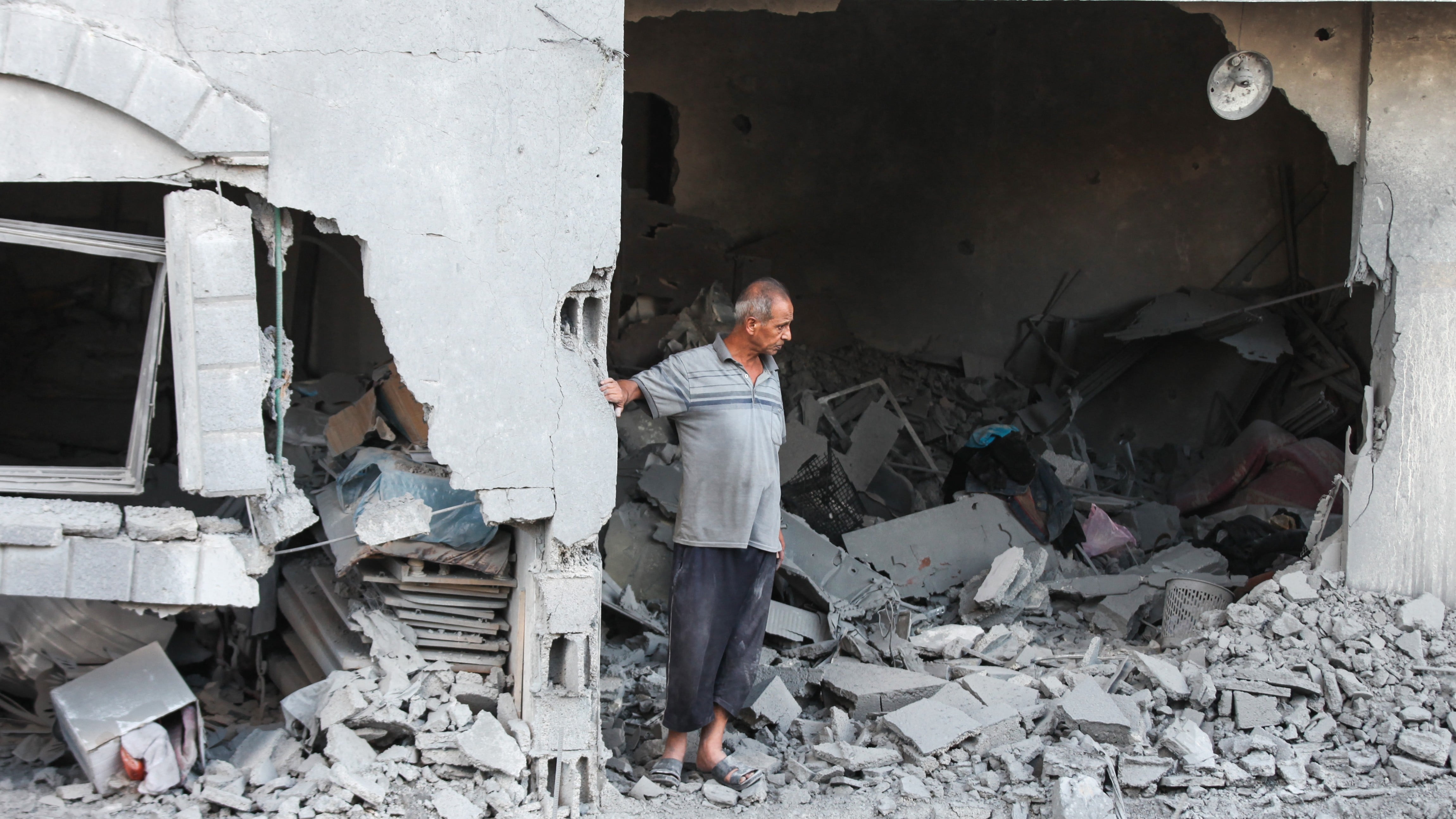 Translation: The aftermath of destruction left by the occupation's shelling of a house in al-Zawaida, central Gaza Strip