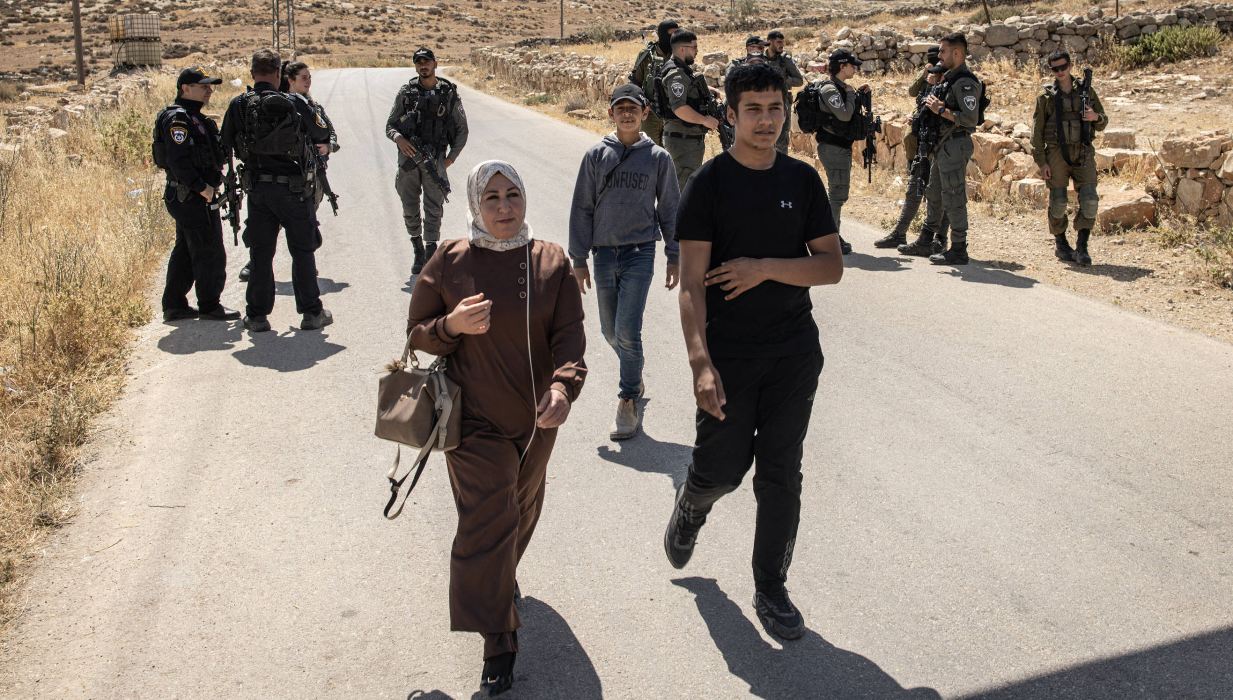 People walk past Israeli security forces as they block the entrance to the village of al-Tuwani in the Masafer Yatta area in occupied West Bank on 2 June 2025 (AFP)