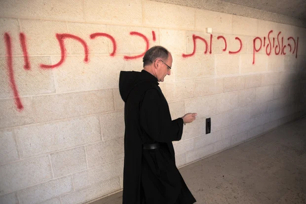 Red spray-painted Hebrew graffiti was found on another building within the complex, reading "Idols will be cast out" or destroyed, an AFP correspondent reported. The text is part of a common Jewish prayer.