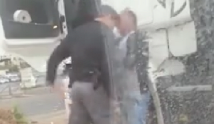 The attack happened in the Palestinian area of Wadi Joz in East Jerusalem. The officer, a member of the Yasam reconnaissance unit, head-butts then repeatedly slaps the truck driver as he is trying to speak.