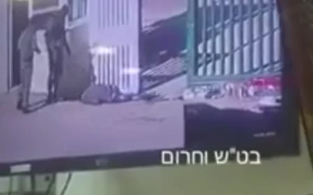 Several Arab workers are seen attempting to diffuse the situation, causing the officer to kick out towards them violently, shouting "get out of here, all of you".