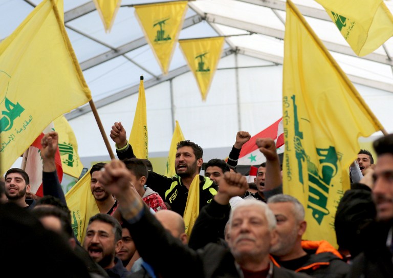 Hezbollah supporters chant slogans during a televised speech by Hassan Nasrallah, the head of Hezbollah, in Beirut on 15 March 2015 (AFP)