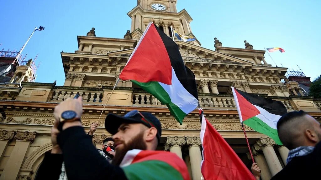 Protesters wave Palestinian flags during a demonstration against Israel in Sydney on 15 May, 2021 (AFP)