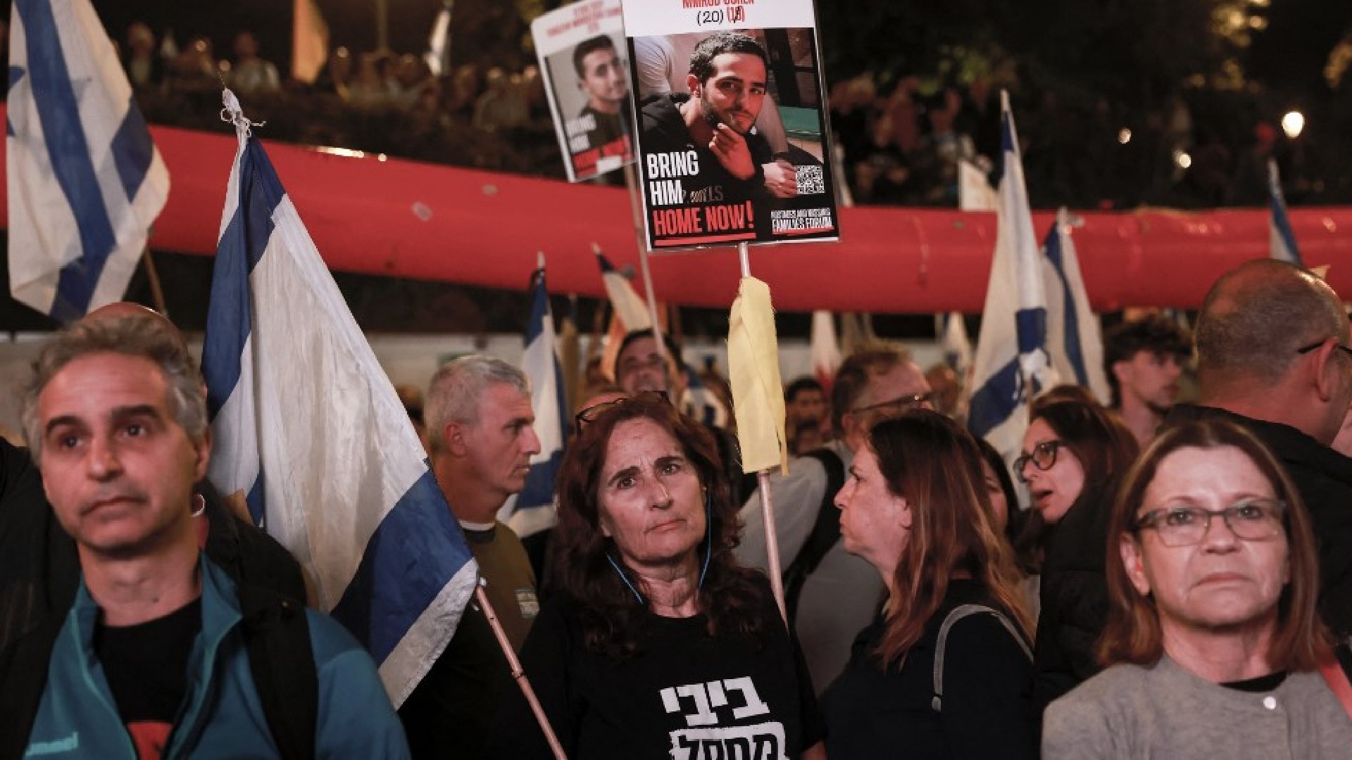 Anti-government demonstrators carry pictures of Israeli hostages during a protest outside the Israeli parliament in Jerusalem on 26 March (AFP)