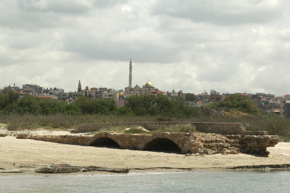 Jisr al-Zarqa is seen from the beach, beyond the remains of the Ottoman-era bridge that is the town's namesake (MEE/Dave Leins)