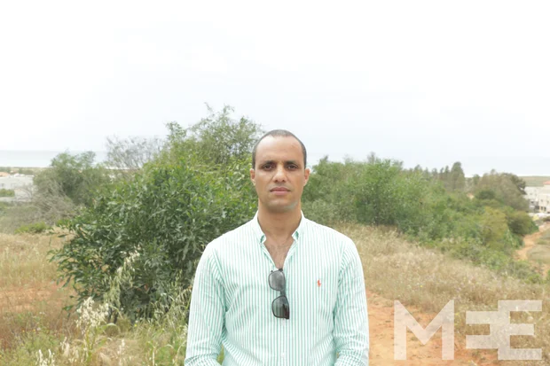 Joint List spokesman Sami al-Ali poses for a photo on top of the earth embankment that divides Jisr from the wealthy city of Caesarea (MEE/Dave Leins)