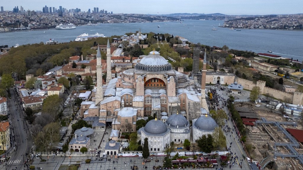 This aerial photograph shows scaffolds installed on the Hagia Sophia Grand Mosque in Istanbul on April 14, 2025 (AFP/Yasin Akgul)