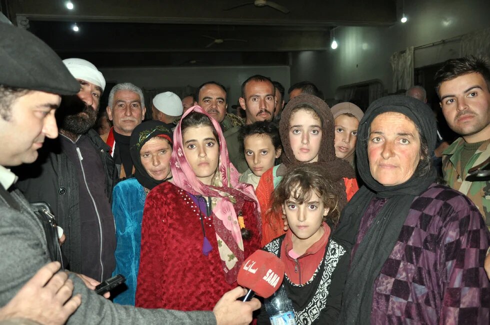 Syrian television broadcast images of women, boys, and at least one girl surrounded by men in military uniforms near a white pick-up truck in a desert landscape.