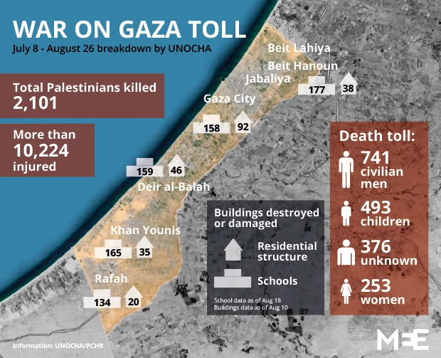 By the time a ceasefire was reached on 27 August, some 2,100 people in the Gaza Strip, most of them civilians, and 72 Israelis, 66 of them soldiers, were dead.