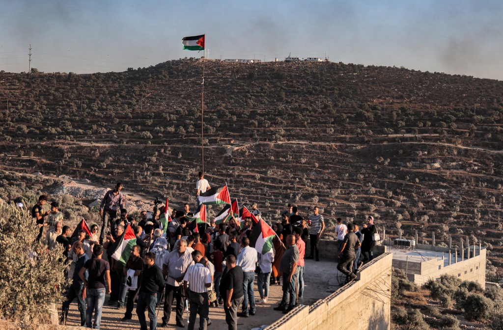 Palestinian protesters gather during a demonstration against the Israeli settlers' wildcat outpost of Eviatar, in the town of Beita, near the occupied West Bank city of Nablus (AFP)