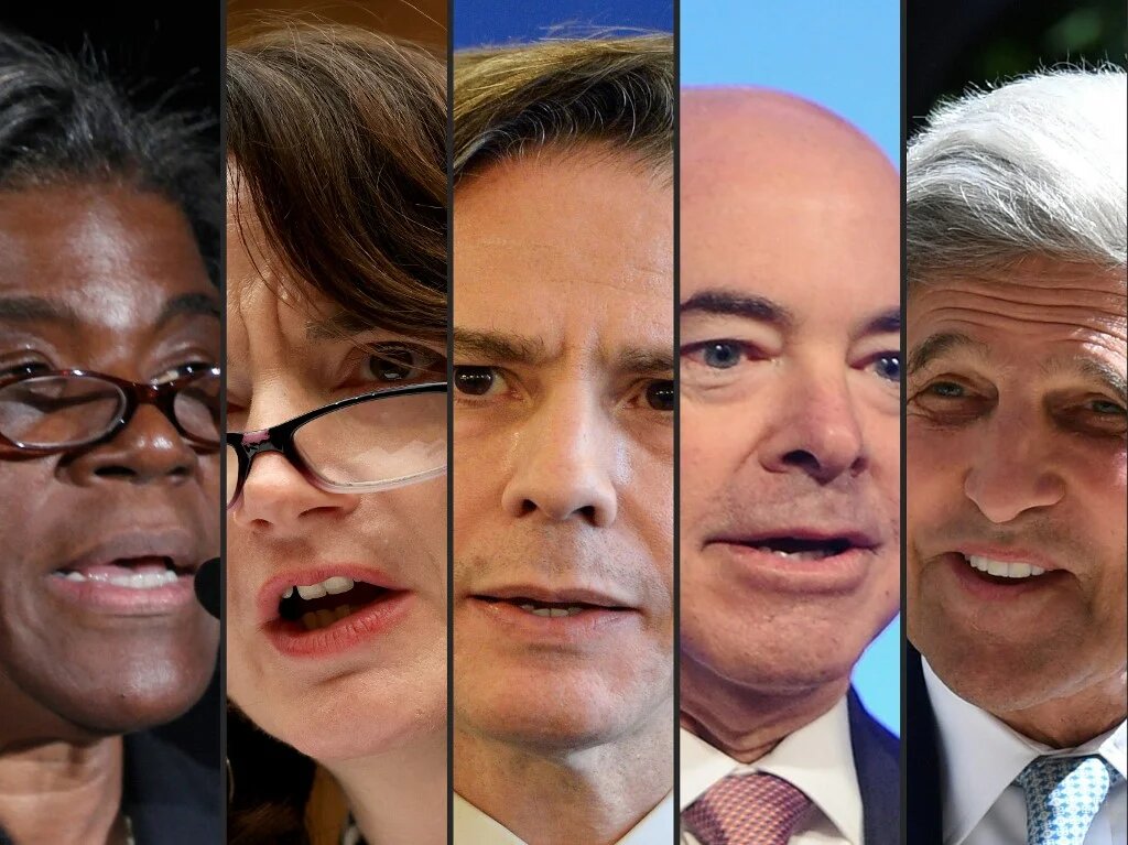 From left to right: Linda Thomas-Greenfield, chosen for US ambassador to UN; Avril Haines, chosen for director of national intelligence; Antony Blinken, chosen for secretary of state; Alejandro Mayorkas, chosen for secretary of homeland security; and John Kerry, chosen for presidential climate envoy (AFP)